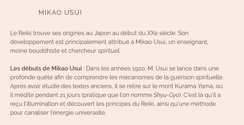 Son fondateur Mikao Usui, décida après ses découvertes, de fonder son système : le Usui Reiki Ryoho dans le but de partager sa méthode afin qu’elle soit accessible à tous.