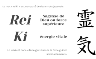 Le Reiki est une technique ancestrale qui vient du Japon. Le mot Reiki est composé de deux kanjis japonais : le "Rei" qui signifie "puissance universelle" et le "Ki" qui signifie "force vitale", qui se réfère à l’énergie vitale présente chez tous les êtres vivants : "l’énergie de force vitale universelle".